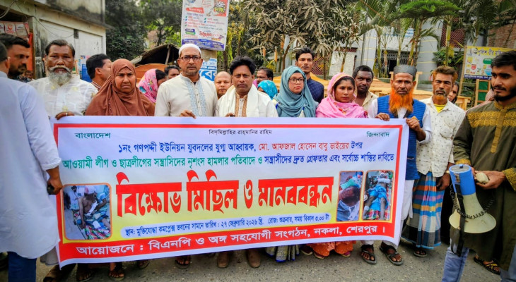শেরপুরে আওয়ামী সন্ত্রাসীদের গ্রেপ্তার দাবিতে মানববন্ধন