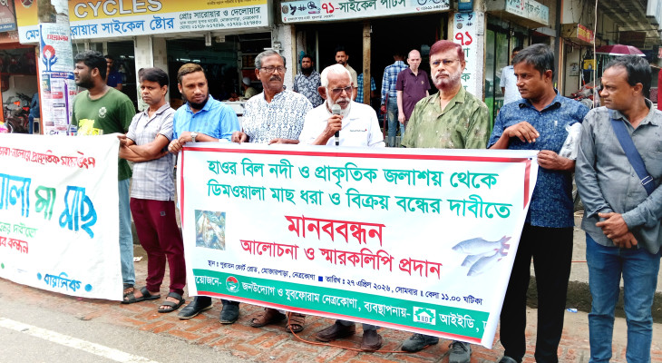 নেত্রকোনায় ডিমওয়ালা মাছ ধরার বিরুদ্ধে মানববন্ধন ও স্মারকলিপি প্রদান