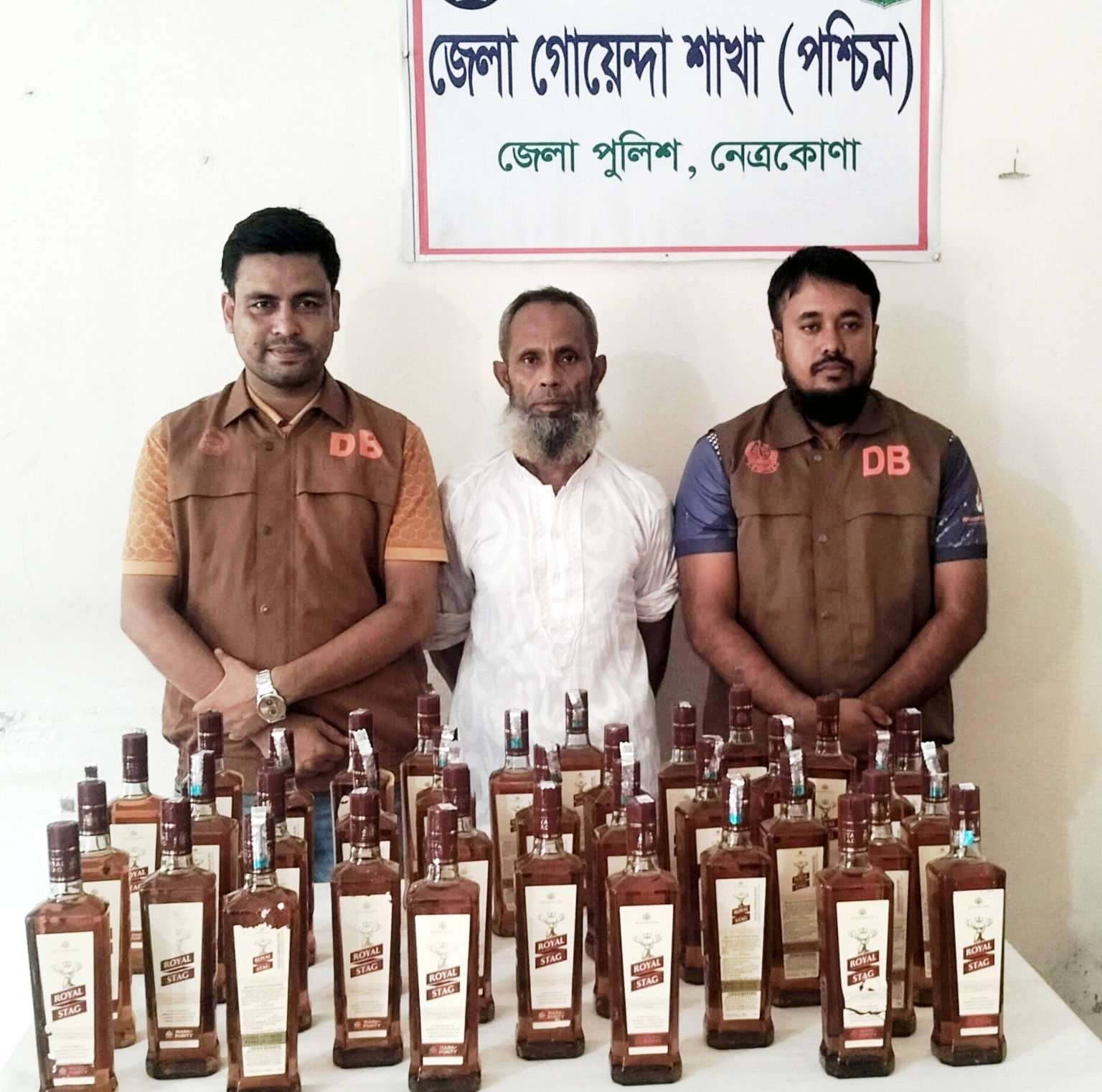 নেত্রকোনায় ডিবি পুলিশের অভিযানঃ ৩৬ বোতল ভারতীয় মদসহ এক মাদক ব্যবসায়ী আটক