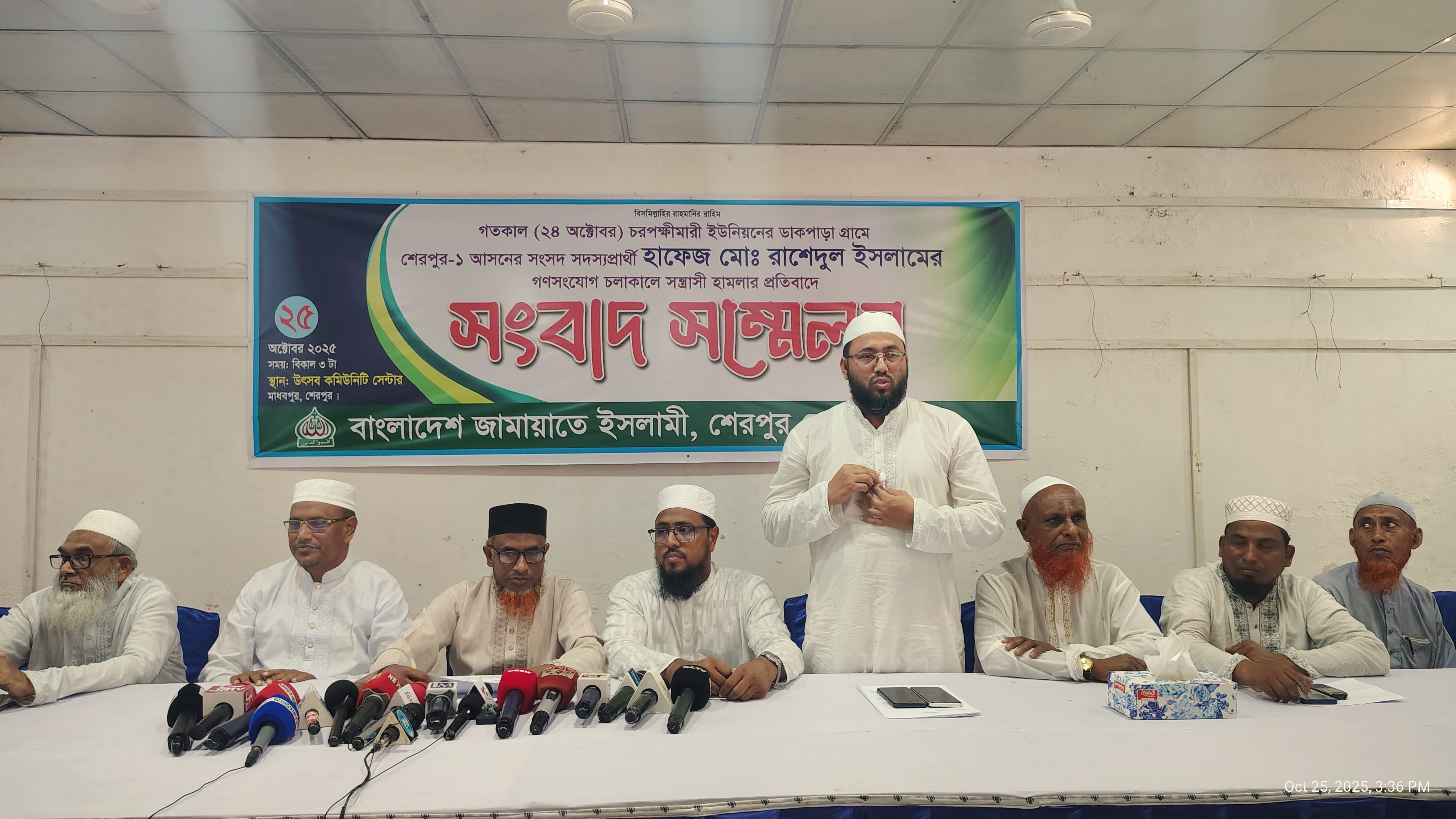 শেরপুরে জামায়াতের গণসংযোগ চলাকালে সন্ত্রাসী হামলার প্রতিবাদে সংবাদ সম্মেলন