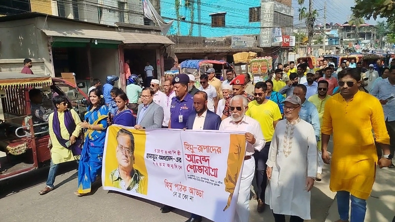 আনন্দ শোভাযাত্রার নেতৃত্ব দেন জেলা প্রশাসক মোহাম্মদ আব্দুল্লাহ আল মাহমুদ জামান, পুলিশ সুপার মির্জা সায়েম মাহমুদ, অতিরিক্ত জেলা ম্যাজিস্ট্রট সুখময় সরকার ও জেলা প্রেসক্লাবের সাবেক সহ সভাপতি বীর মুক্তিযোদ্ধা হায়দার জাহান চৌধুরী। আনন্দ শোভাযাত্রায় অংশ গ্রহণকারীরা হুমায়ুন আহমেদের বিভিন্ন নাটক ও সিনেমায় ব্যবহৃত জনপ্রিয় গানের সাথে নেচে গেয়ে আনন্দ শোভাযাত্রায় আনন্দ করতে করতে জেলা শহরের বিভিন্ন গুরুত্বপূর্ণ সড়ক প্রদক্ষিণ করে মোক্তার পাড়া মুক্ত মঞ্চে এসে ৭৭তম জন্ম দিনের কেক কাটা হয়।