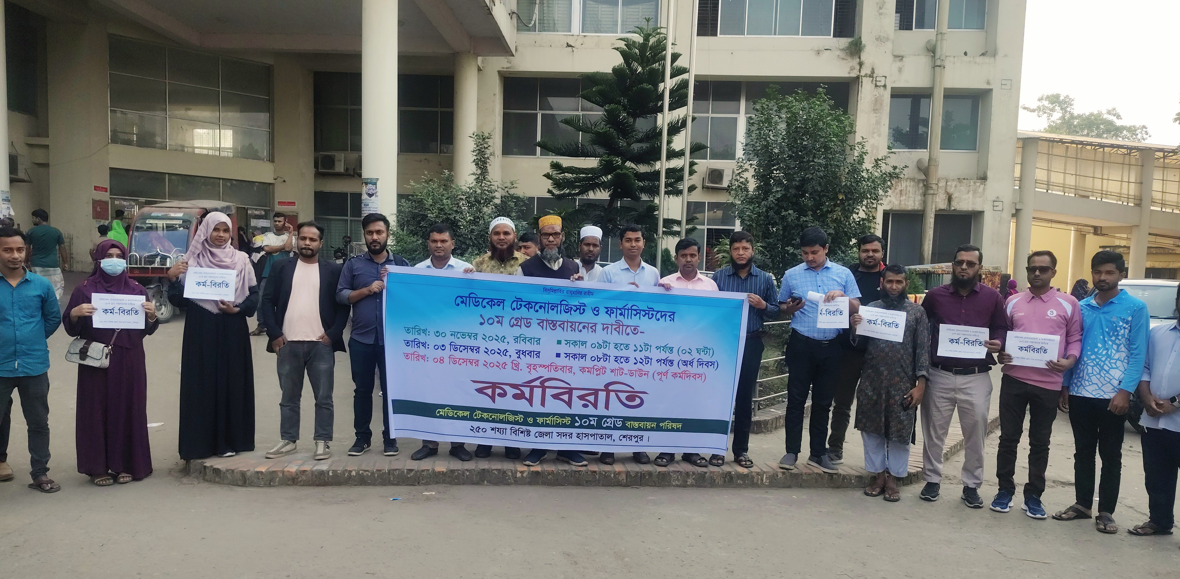 শেরপুরে মেডিকেল টেকনোলজিস্ট ও ফার্মাসিস্টের ১০ম গ্রেড বাস্তবায়নের দাবিতে দুই ঘন্টার কর্ম বিরতি পালন করেছে।