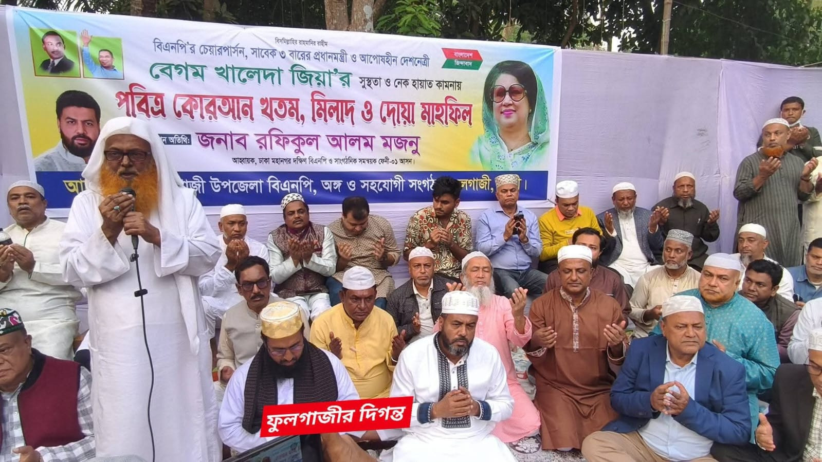 সভাপতিত্ব করেন ফুলগাজী উপজেলা বিএনপির আহবায়ক ফখরুল আলম স্বপন অনুষ্ঠানটি পরিচালনা করেন উপজেলা বিএনপির সদস্য সচিব আবুল হোসেন ভূঁইয়া, উক্ত দোয়া মাহফিলে প্রধান অতিথি হিসেবে উপস্থিত ছিলেন ফেনী-১ আসনের সাংগঠনিক সমন্বয়ক ও ঢাকা মহানগর দক্ষিণ বিএনপির আহবায়ক জননেতা রফিকুল আলম মজনু। তিনি তার বক্তব্য বেগম খালেদা জিয়ার দ্রুত আরোগ্য কামনা করেন এবং নেতাকর্মীদের ঐক্যবদ্ধ থাকার আহ্বান জানান। জহির হোসাইন আসিফ মজুমদার ও ২০১৮ নির্বাচনের ফুলগাজী উপজেলার সমন্বয়কারী লায়ন মির্জা মাসুদুর রহমানের সার্বিক ব্যবস্থাপনায় আয়োজিত মাহফিলে বেগম খালেদা জিয়ার সুস্থতা কামনায় বিশেষ মোনাজাত পরিচালনা করেন ওলেমা দলের সাবেক সভাপতি মাওলানা জামাল উদ্দিন খন্দকার। এছাড়াও দোয়া মাহফিলে বিএনপি'র কেন্দ্রীয় নির্বাহী কমিটির সদস্য আবু তালেব ফুলগাজী উপজেলা বিএনপির যুগ্ম আহ্বায়ক যথাক্রমে মাস্টার আবুল কালাম আবুল খায়ের সিরাজুল ইসলাম মন্টু আখতারুজ্জামান আজিম দপ্তর সম্পাদক ইয়াসিন মজুমদার উপজেলা যুবদলের আহ্বায়ক ফরিদ আহাম্মেদ ভূঁইয়া যুগ্ম আহ্বায়ক নুরুল হুদা শাহীন মোশারফ হোসেন চৌধুরী সোহেল উপজেলা স্বেচ্ছাসেবক দলের আহ্বায়ক ইসলাম রসূল যুগ্ম আহবায়ক আবুল উপজেলা ছাত্রদলের আহবায়ক মোহাম্মদ ইউসুফ আহবায়ক আব্দুল আলিম বাবুসহ বিভিন্ন পর্যায়ের বিপুল সংখ্যক নেতাকর্মী উপস্থিত।
