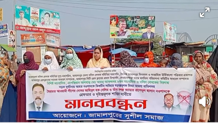 বাংলাদেশ দলিল লেখক সমিতির যুগ্ম-মহাসচিব, জামালপুর জেলা দলিল লেখক সমিতির সভাপতি, দৈনিক জামালপুর দিনকাল ও সাপ্তাহিক উর্মিবাংলা পত্রিকার প্রকাশক জামালপুর প্রেসক্লাবের সাবেক সাধারণ সম্পাদক, জামালপুর সিটি প্রেস ক্লাবের প্রধান উপদেষ্টা, দেওয়ানপাড়া জামে মসজিদ পরিচালনা কমিটির সাধারণ সম্পাদক, বিশিষ্ট সাংবাদিক, এপেক্সিয়ান, আলহাজ্ব মোঃ আরজু আকন্দসহ ৮জন সাংবাদিক ও দলিল লেখকের বিরুদ্ধে সড়ক দুর্ঘটনায় আহত নওশাদকে ভিকটিম সাজিয়ে ষড়যন্ত্রমূলক মিথ্যা মামলা বাতিলসহ স্বৈরাচার আওয়ামী লীগের দোসর জাহিদুল হক সেলিম ও তাঁর সশস্ত্র ক্যাডার রাশেদুল হাসান নওশাদকে অনতিবিলম্বে গ্রেফতার ও দৃষ্টান্তমূলক শাস্তির দাবীতে মানববন্ধন অনুষ্ঠিত হয়েছে।