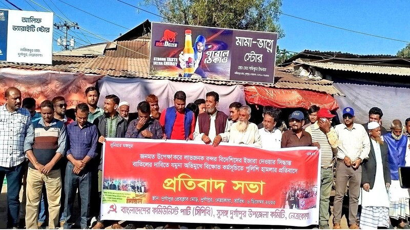 জনমতের সুস্পষ্ট ইচ্ছা উপেক্ষা করে লাভজনক চট্টগ্রাম বন্দর বিদেশী কোম্পানির কাছে ইজারা দেওয়ার সরকারি সিদ্ধান্ত বাতিলের দাবিতে আয়োজিত ‘‘যমুনা অভিমুখে বিক্ষোভ কর্মসূচিতে’’ পুলিশের ন্যাক্কারজনক হামলার তীব্র প্রতিবাদে নেত্রকোনার দুর্গাপুরে এক প্রতিবাদ সভা অনুষ্ঠিত হয়েছে।
