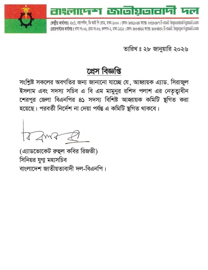 বিজ্ঞপ্তিতে বলা হয়, আহ্বায়ক অ্যাডভোকেট সিরাজুল ইসলাম এবং সদস্যসচিব এ বি এম মামুনুর রশিদ পলাশের নেতৃত্বাধীন শেরপুর জেলা বিএনপির আহ্বায়ক কমিটি স্থগিত করা হয়েছে।
