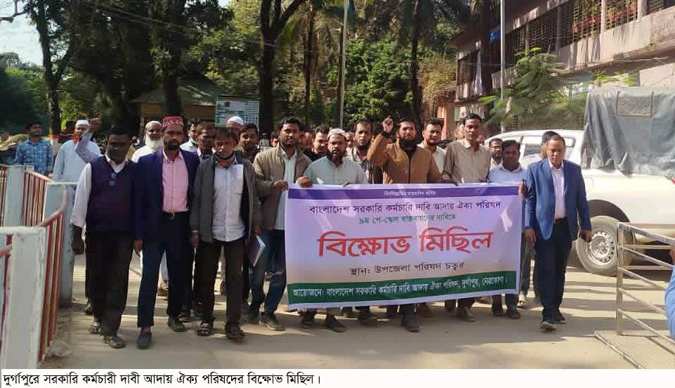 নেত্রকোনার দুর্গাপুর উপজেলার সকল সরকারি দপ্তরের কর্মচারীদের সমন্বয়ে নবম জাতীয় পে-স্কেল ঘোষনার দাবিতে এক বিক্ষোভ মিছিল অনুষ্ঠিত হয়েছে। বুধবার (২৮ জানুয়ারী) দুপুরে উপজেলা পরিষদ চত্বরে এ বিক্ষোভ মিছিল অনুষ্ঠিত হয়। মিছিলটি শহরের প্রধান প্রধান সড়ক প্রদক্ষিণ করে।