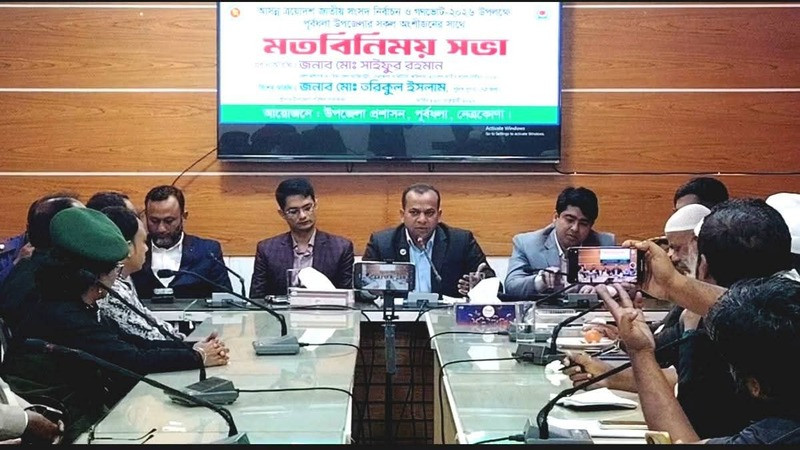 ত্রয়োদশ জাতীয় সংসদ নির্বাচন ও গণভোটকে সামনে রেখে নেত্রকোনার পুর্বধলায় বিভিন্ন স্তরের লোকজনদের সাথে উপজেলা প্রশাসনের উদ্যোগে মতবিনিময় সভা অনুষ্ঠিত হয়েছে। উপজেলা পরিষদ সভাকক্ষে গত শনিবার ৭ (ফেব্রুয়ারি) আয়োজিত মতবিনিময় সভায় প্রধান অতিথি ছিলেন জেলা প্রশাসক ও রিটার্নিং অফিসার মোঃ সাইফুর রহমান।