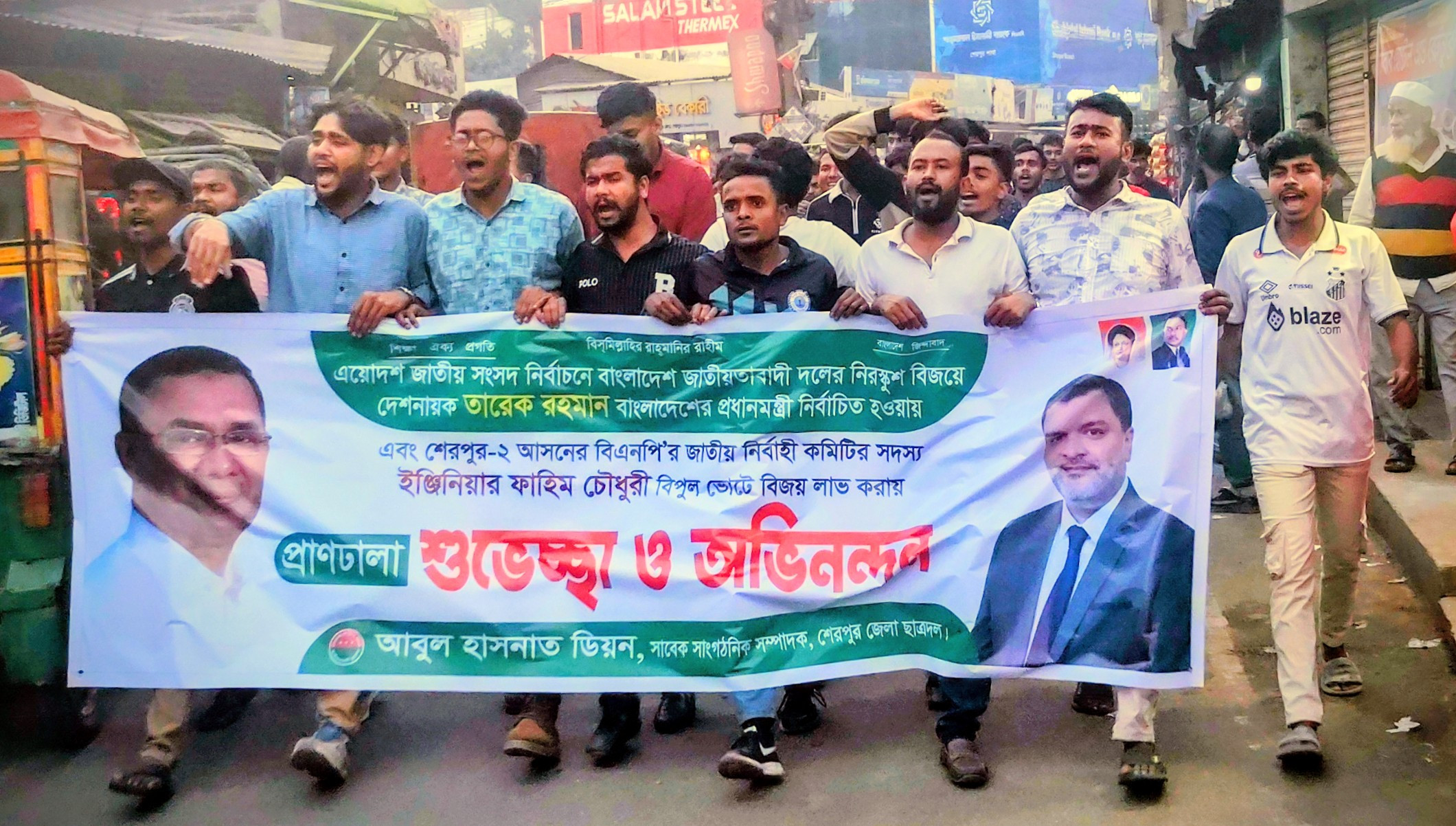 শেরপুর-২ আসনের বিএনপি ধানের শীষ মনোনীত প্রার্থী ইঞ্জিনিয়ার ফাহিম চৌধুরী বিপুল ভোটে বিজয় লাভ করায়ও এই আনন্দ মিছিলে একাত্মতা প্রকাশ করা হয়। এসময় জেলা ছাত্রদলের বিভিন্ন স্তরের নেতাকর্মী ও সমর্থকরা মিছিল অংশ নেয়।
