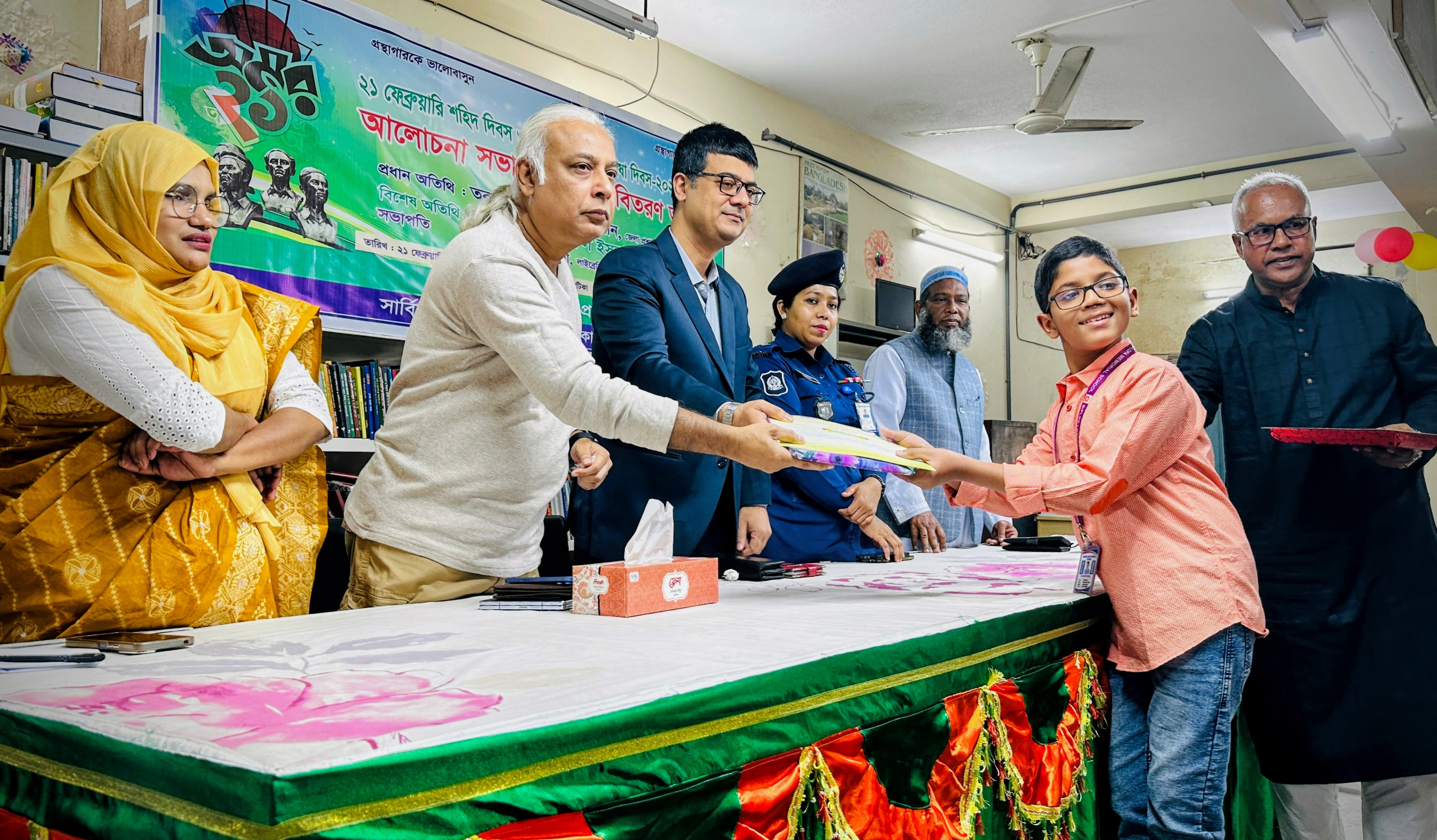 পরে অতিথিরা জেলা প্রশাসন, জেলা শিশু একাডেমী এবং সরকারি গণগ্রন্থাগারের পৃথক আয়োজনে শহীদ দিবস ও আন্তর্জাতিক মাতৃভাষা দিবস উপলক্ষে চিত্রাঙ্কন, রচনা ও আবৃত্তি প্রতিযোগিতায় বিজয়ীদের মধ্যে পুরস্কার বিতরণ করা হয়।