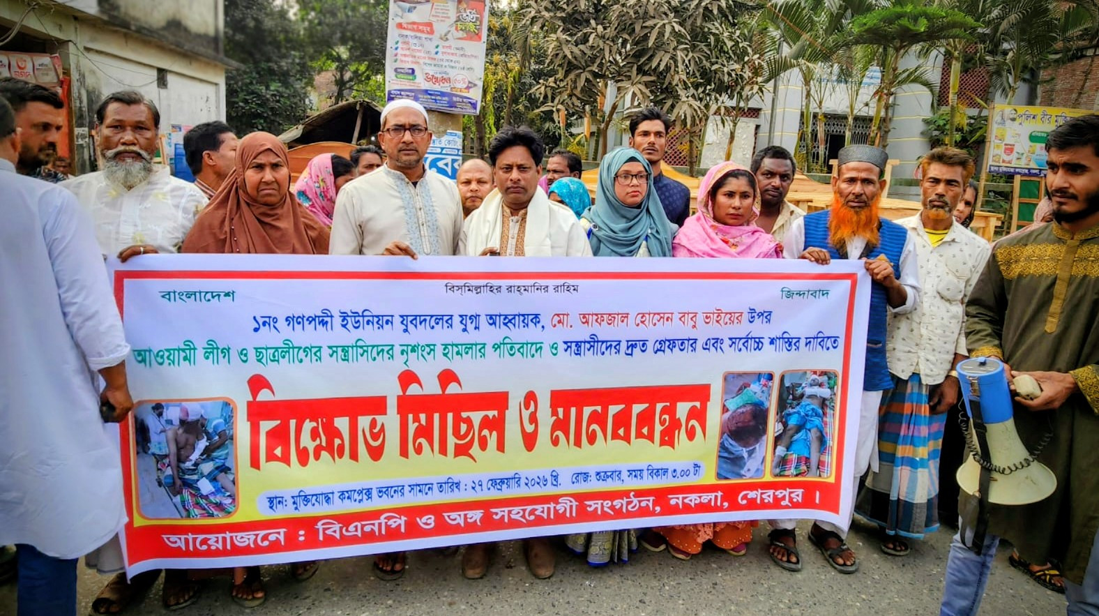 উল্লেখ্য, গত ২৩ ফেব্রুয়ারি রাতের বেলা ওই যুবদল নেতা আফজাল হোসেন বাবু বাড়ি থেকে পার্শ্ববর্তী মুন্সির বাজার এলাকায় গেলে ৬/৭ জনের আওয়ামী সন্ত্রাসী দেশীয় অস্ত্র নিয়ে হামলা চালায়। পরে তাকে এলাকাবাসী উদ্ধার করে প্রথমে নকলা উপজেলা স্বাস্থ্য কমপ্লেক্সে ও পরে ময়মনসিংহ এবং সর্বশেষ ঢাকায় উন্নত চিকিৎসার জন্য পাঠানো হয়েছে।