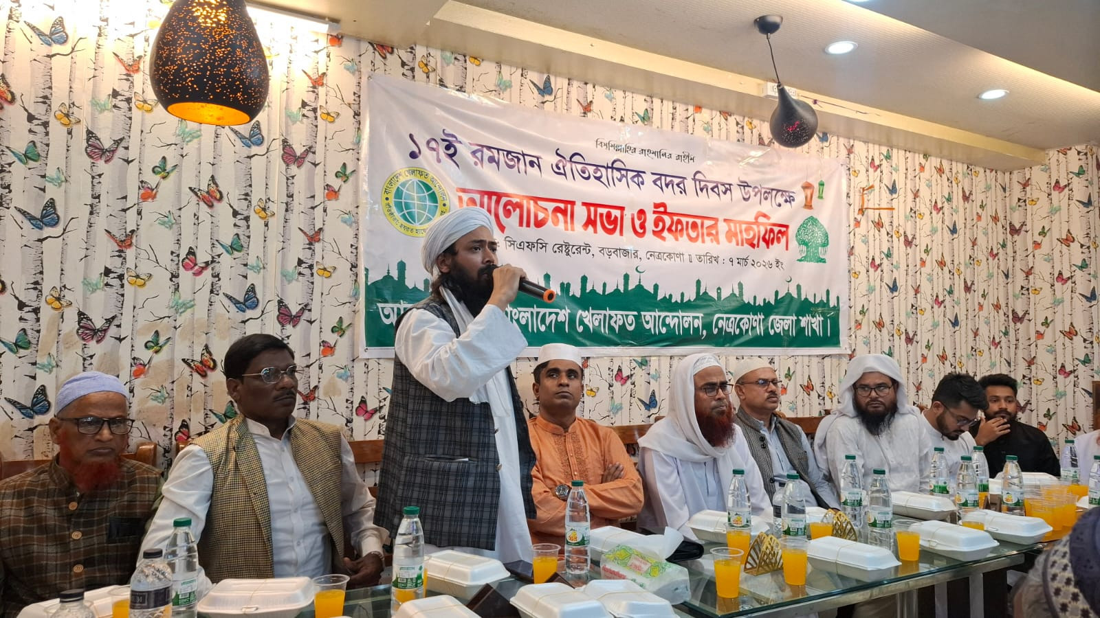 নেত্রকোনা জেলা খেলাফত আন্দোলনের নায়েবে আমীর মাওলানা মোস্তফা আহমেদ জিহাদী এর সভাপতিত্বে বাংলাদেশ খেলাফত যুব আন্দোলন এর সভাপতি হাফেজ মাওলানা মুসা এর সঞ্চালনায় আলোচনা সভায় ঐতিহাসিক বদর যুদ্ধের তাৎপর্য তুলে ধরে মুসলিম উম্মাহর ঐক্য, ভ্রাতৃত্ববোধ, শান্তি, নীতি-নৈতিকতা ও ত্যাগের আদর্শ অনুসরণের ওপর গুরুত্বারোপ করে বক্তব্য রাখেন বাংলাদেশ খেলাফত আন্দোলন-এর কেন্দ্রীয় কমিটির সহকারী মহাসচিব গাজী আব্দুর রহিম রুহী, জেলা বিএনপির সাবেক সাংগঠনিক সম্পাদক ও লক্ষীগঞ্জ ইউনিয়ন পরিষদের সাবেক চেয়ারম্যান এস এম শফিকুল কাদের সুজা, জেলা কৃষক দলের সভাপতি ও কে-গাতী ইউনিয়ন পরিষদের সাবেক চেয়ারম্যান মোঃ সালাহউদ্দিন খান মিল্কী, নেত্রকোনা পৌর বিএনপির সাবেক ভারপ্রাপ্ত সভাপতি মোঃ কামরুল হক, জাতীয় নাগরিক পার্টির (এনসিপি) কেন্দীয় কমিটির সদস্য ফাহিম রহমান খান পাঠান,