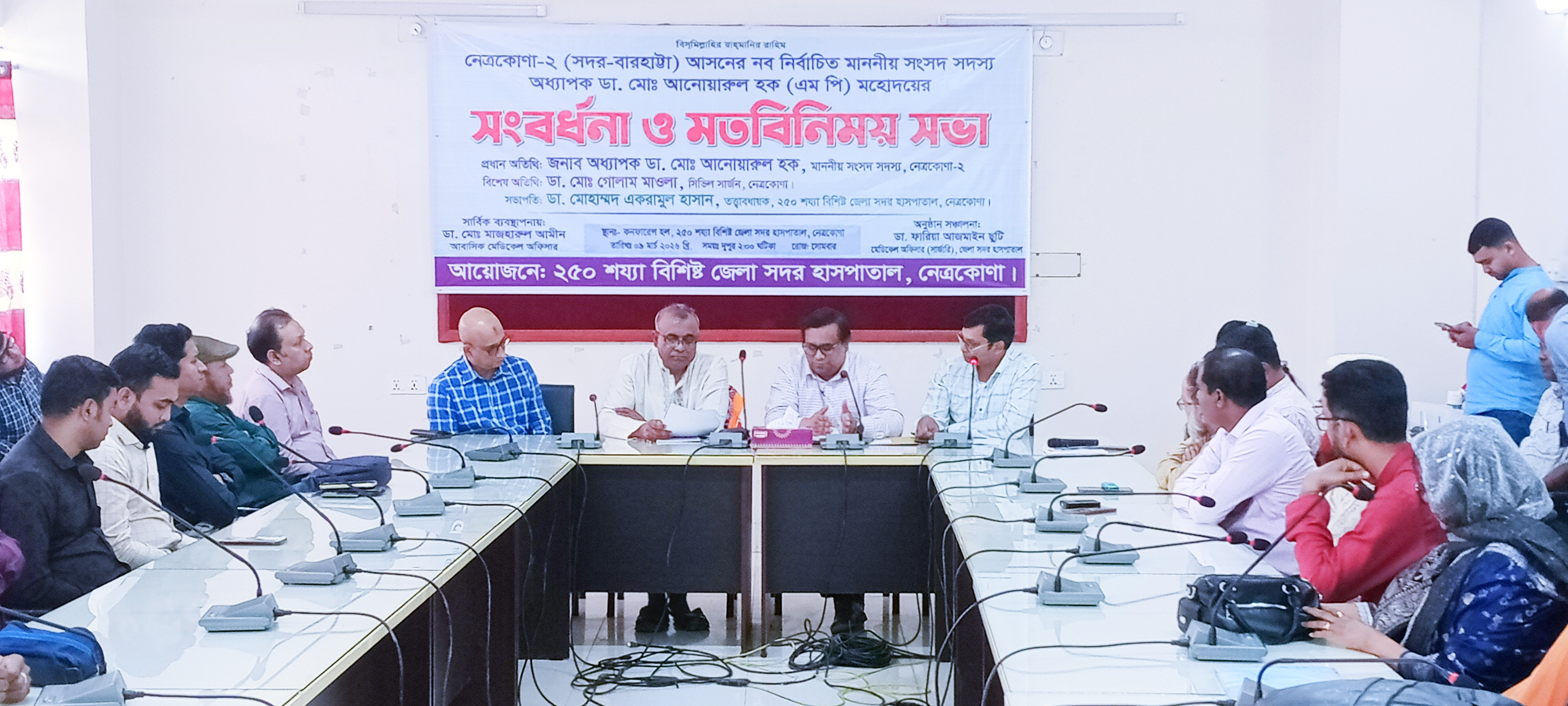 নেত্রকোণা জেলা আধুনিক সদর হাসপাতালের তত্ত্বাবধায়ক ডা. মোহাম্মদ একরামুল হাসান এর সভাপতিত্ব মেডিকেল অফিসার (সার্জারী) ডা. ফারিয়া আজমাইন ছুটি এর সঞ্চালনায় সংবর্ধনা ও মত বিনিময় সভা বিশেষ অতিথি হিসেবে বক্তব্য রাখেন, নেত্রকোণার সিভিল সার্জন ডাঃ মোঃ গোলাম মাওলা।