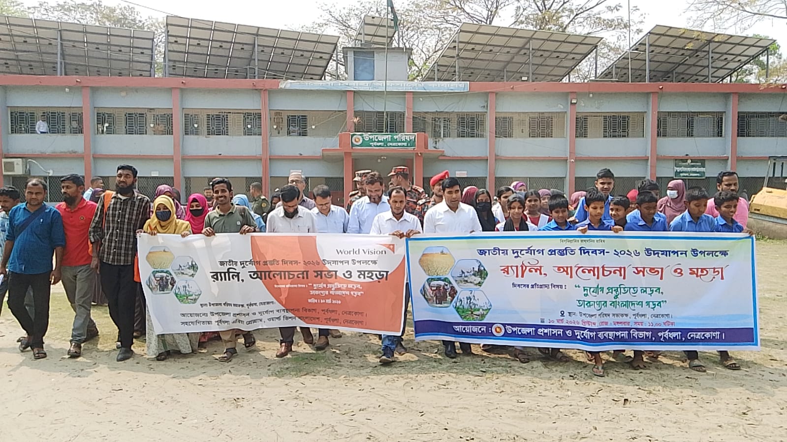 “দুর্যোগ প্রস্তুতিতে লড়ব, তারুণ্যের বাংলাদেশ গড়ব” স্লোগানকে সামনে রেখে নেত্রকোনার পূর্বধলা উপজেলায় জাতীয় দুর্যোগ প্রশমন প্রস্তুতি দিবস উপলক্ষে দুর্যোগ ঝুঁকি হ্রাসে সচেতনতা বৃদ্ধির লক্ষ্যে বর্ণাঢ্য র্যালি, আলোচনা সভা ও অগ্নিনির্বাপণ মহড়া অনুষ্ঠিত হয়েছে।