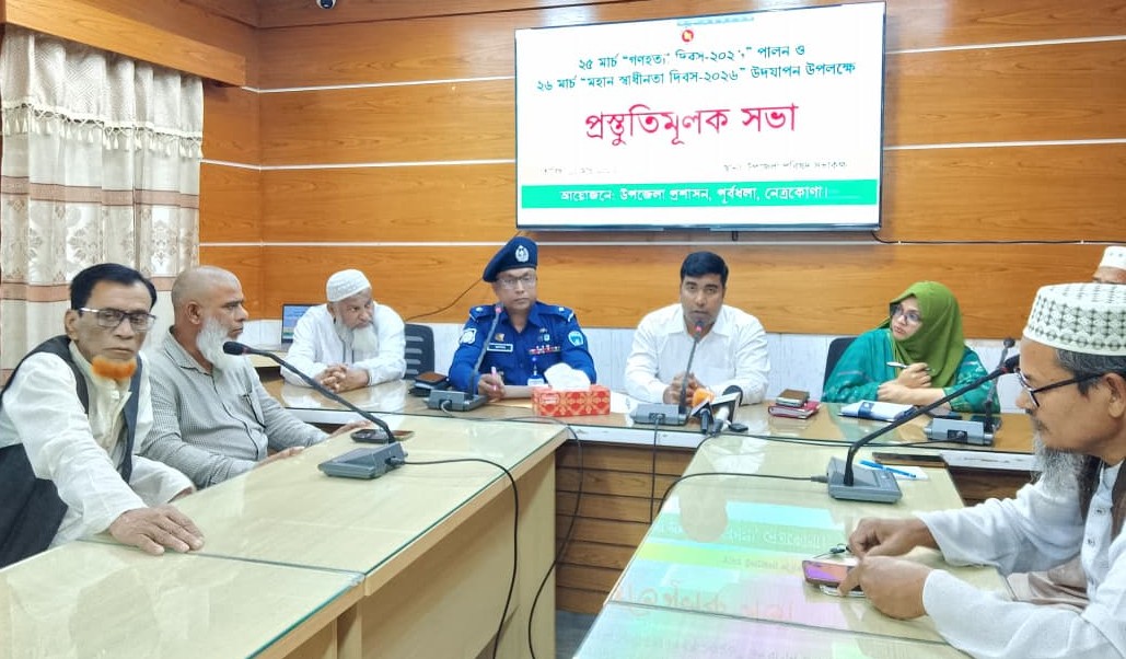 নেত্রকোনার পূর্বধলায় আগামী ২৫ মার্চ গণহত্যা দিবস এবং ২৬ মার্চ মহান স্বাধীনতা ও জাতীয় দিবস-২০২৬ উদযাপন উপলক্ষে প্রস্তুতিমূলক সভা অনুষ্ঠিত হয়েছে।