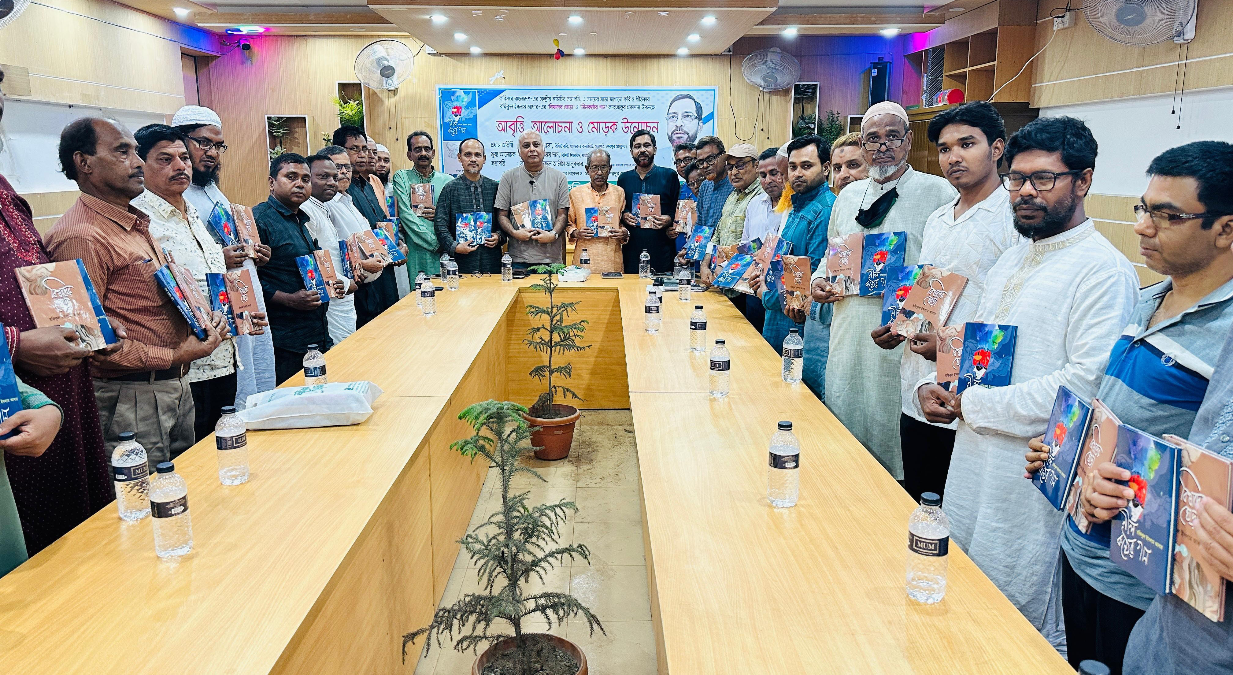 কবিসংঘ বাংলাদেশের সাধারণ সম্পাদক ড. আবদুল আলীম তালুকদারের সভাপতিত্বে অনুষ্ঠানে দুটি কাব্যগ্রন্থ নিয়ে আলোচনায় অংশ নেন প্রেসক্লাবের সাধারণ সম্পাদক মাসুদ হাসান বাদল, কবি অধ্যাপক মোস্তফা জিন্নাহ, কবি আরিফ হাসান, কবি জ্যোতি পোদ্দার, কবি অধ্যক্ষ আইয়ুব আকন্দ বিদ্যুৎ, কবি ও শিশু সাহিত্যিক মোস্তাফিজুল হক, কবি ও গবেষক ড. বিভুতিভ‚ষণ মিত্র, কবি আশরাফ আলী চারু প্রমুখ।