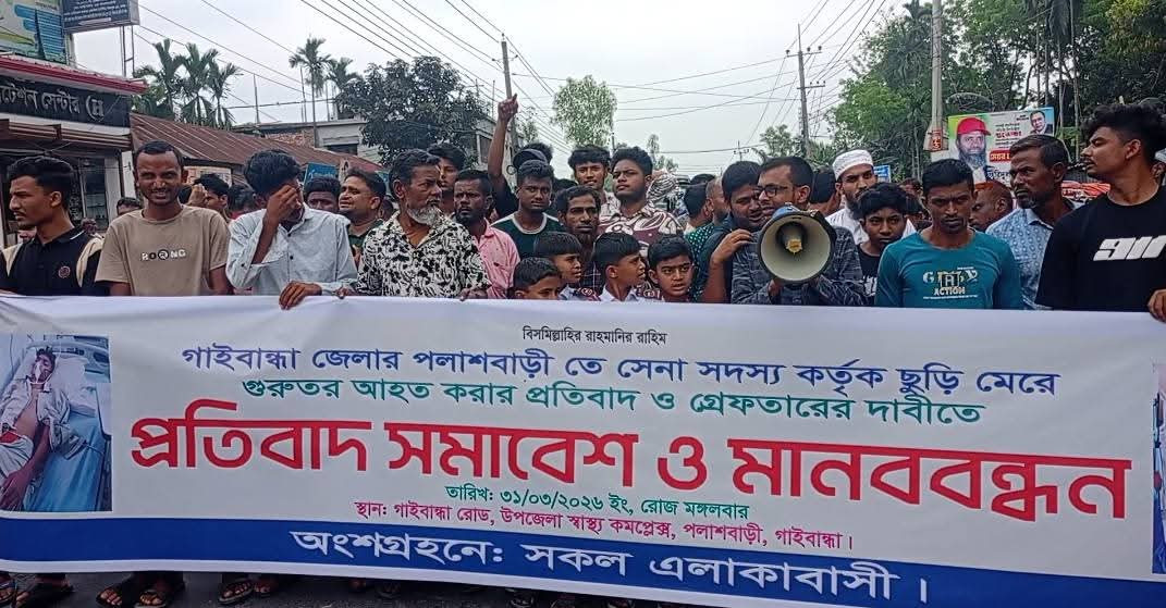 গাইবান্ধার পলাশবাড়ীতে এসএসসি পরীক্ষার্থীকে ছুরিকাঘাত করে আহত করার অভিযোগে সেনা সদস্য আমিনুল ইসলাম বাবুকে গ্রেফতারের দাবিতে মানববন্ধন ও প্রতিবাদ সমাবেশ অনুষ্ঠিত হয়েছে।