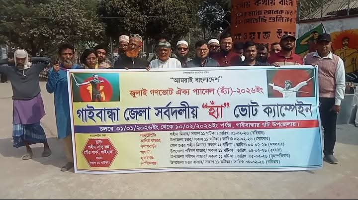 গাইবান্ধা জেলায় সর্বদলীয় গনভোটে হ্যা এর পক্ষে ভোট ক্যাম্পেইন অনুষ্ঠিত হয়েছে। আজ শনিবার বেলা সাড়ে ১১ টার দিকে পৌর পার্কের শহিদ স্মৃতি স্তম্ভে জুলাই গনভোট ঐক্য প্যানেলের ব্যানারে এ ভোট ক্যাম্পেইন অনুষ্ঠিত হয়। এর আগে পবিত্র কোরআন তিলাওয়াতের মাধ্যমে অনুষ্ঠানের সুচনা করা হয়।