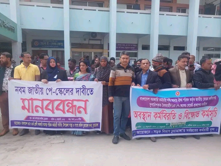 বৈষম্যমুক্ত নবম পে স্কেলের গেজেট প্রকাশ ও (০১) ই পহেলা জানুয়ারি থেকে বাস্তবায়নের দাবিতে চুুয়াডাঙ্গায় সরকারি, আধা সরকারি ও স্বায়ত্তশাসিত অফিসগুলোতে কর্মচারীরা ০৩ ঘণ্টার অবস্থান কর্মসূচি ও বিক্ষোভ সমাবেশ করেছেন।