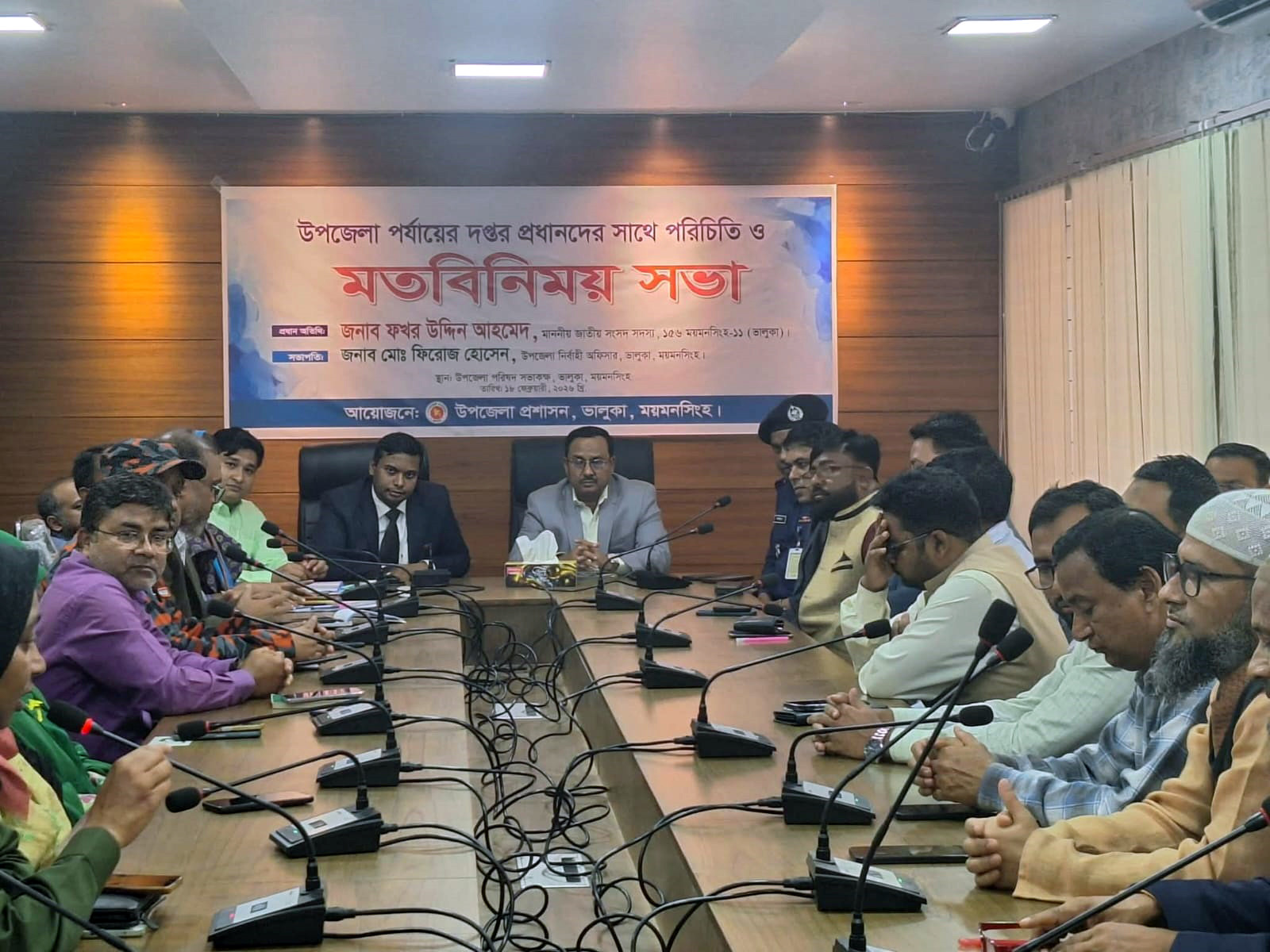 বুধবার (১৮ফেব্রুয়ারি) বিকেল ৩টায় উপজেলা পরিষদ সভাকক্ষে ভালুকা উপজেলা নির্বাহী অফিসার মোঃ ফিরোজ হোসেনের সভাপতিত্বে অনুষ্ঠিত উপজেলা পর্যায়ের দপ্তর প্রধানদের সাথে নব নির্বাচিত সংসদ সদস্যের পরিচিতি ও মতবিনিময় সভায় প্রধান অতিথি হিসেবে উপস্থিত ছিলেন ময়মনসিংহ ১১ ভালুকা আসনের জাতীয় সংসদ সদস্য ফখর উদ্দিন আহমেদ বাচ্চু। অনুষ্ঠানে প্রধান অতিথি সকলের সার্বিক সহযোগিতা কামনা করে বলেন, জনগণের ভোটে নির্বাচিত প্রতিনিধি হিসেবে ভালুকার মানুষের নিরাপত্তা, ন্যায়বিচার ও অধিকার রক্ষা করা তার নৈতিক দায়িত্ব। কোনো ব্যক্তি বা গোষ্ঠী যদি সাধারণ মানুষের জমি, ব্যবসা-বাণিজ্য কিংবা ব্যক্তিগত জীবনে হস্তক্ষেপ করে অন্যায় সুবিধা নেয়ার চেষ্টা করে, তাদের বিরুদ্ধে কঠোর অবস্থান নেয়া হবে। সর্বপরি ভালুকাকে চাঁদাবাজি, দখলবাজি ও সন্ত্রাসমুক্ত রাখতে প্রশাসনের সঙ্গে সমন্বয় করে কাজ করা হবে।