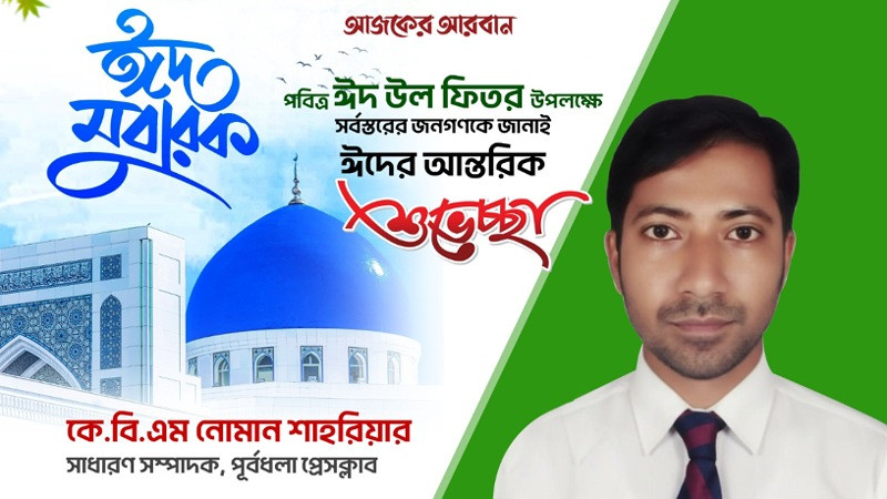 পবিত্র ঈদুল ফিতর উপলক্ষে পূর্বধলা প্রেসক্লাবের সাধারণ সম্পাদক কে.বি.এম নোমান শাহরিয়ার এর শুভেচ্ছা