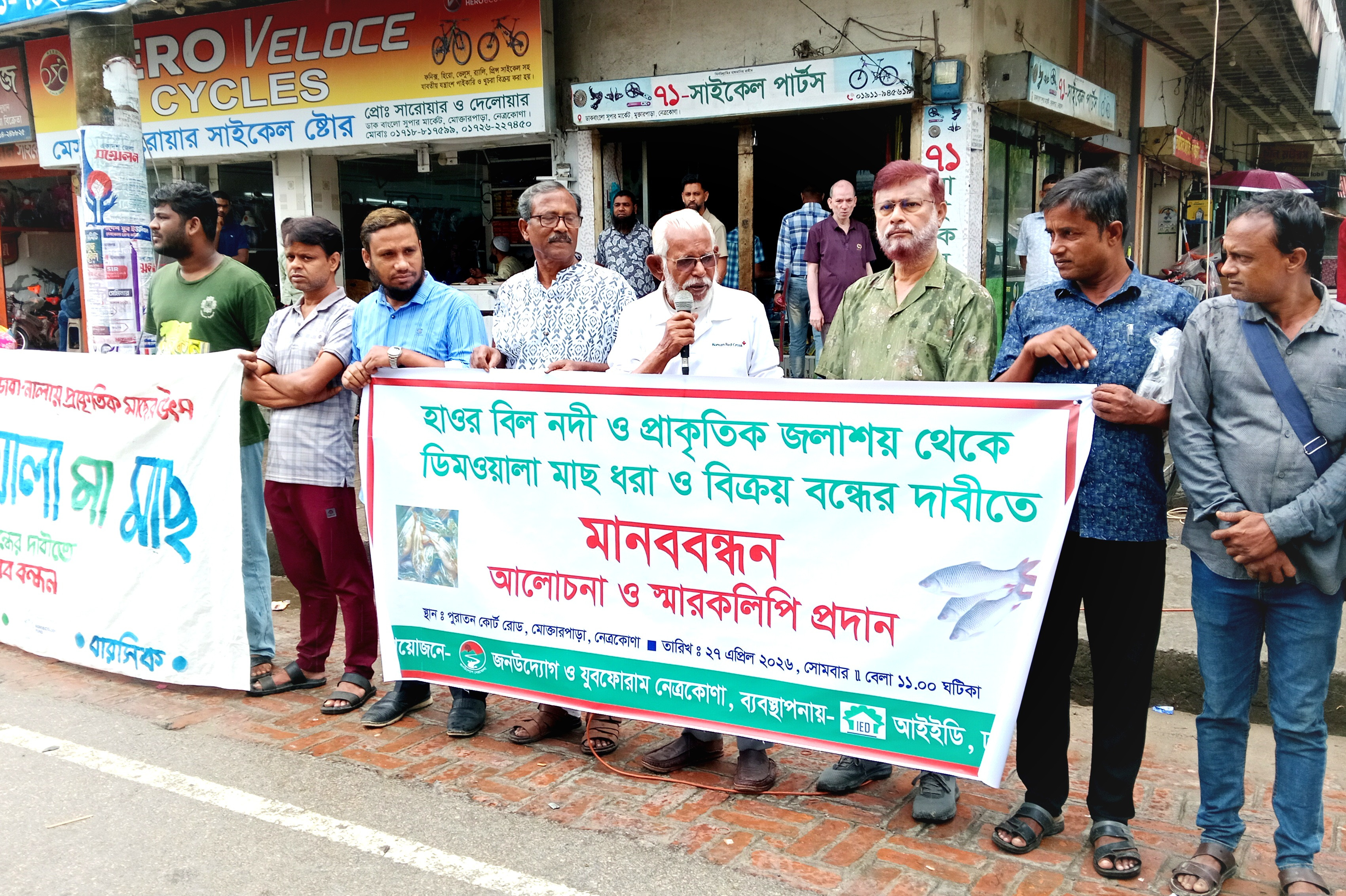 নেত্রকোনায় ডিমওয়ালা মাছ ধরার বিরুদ্ধে মানববন্ধন ও স্মারকলিপি প্রদান